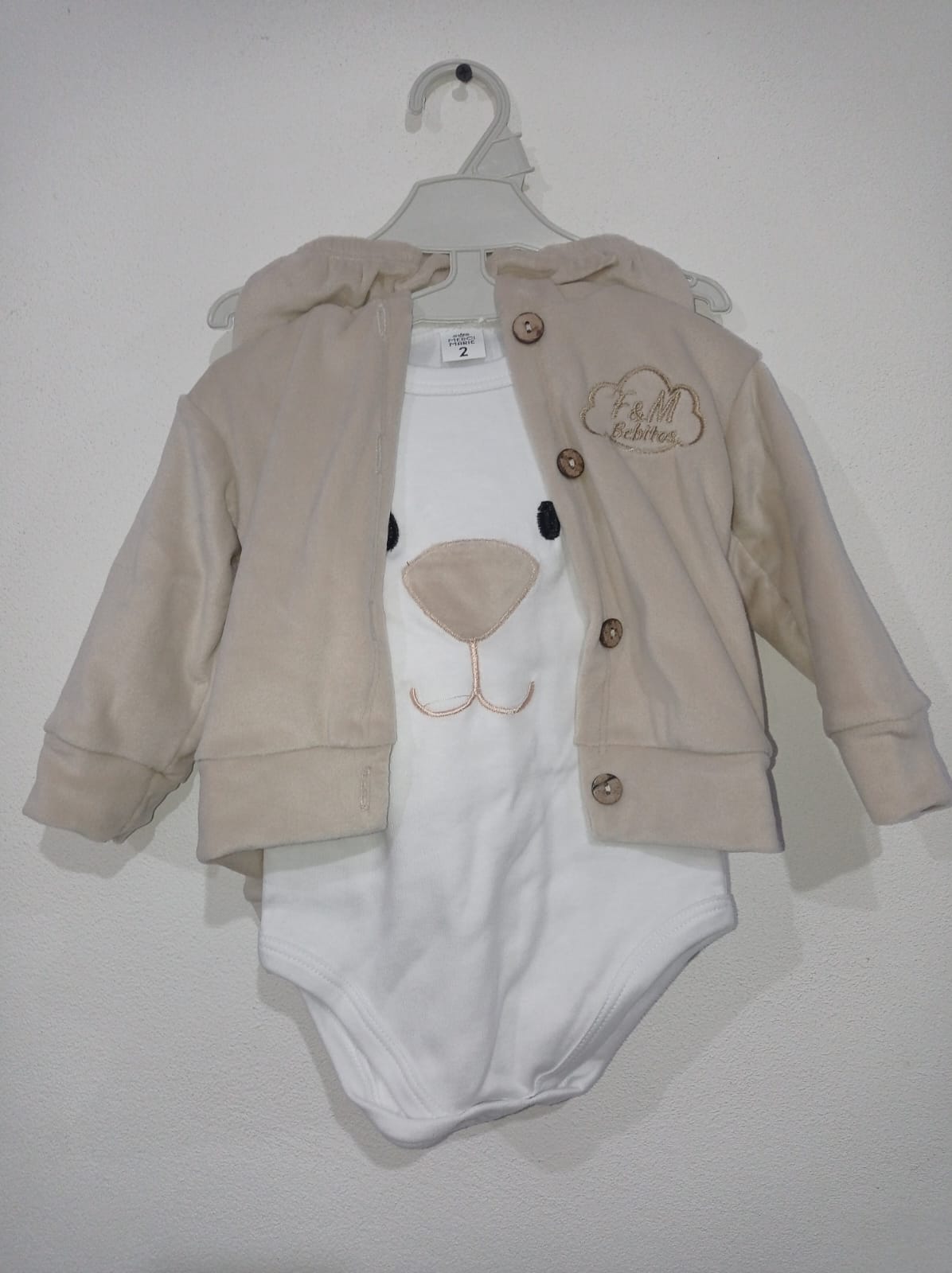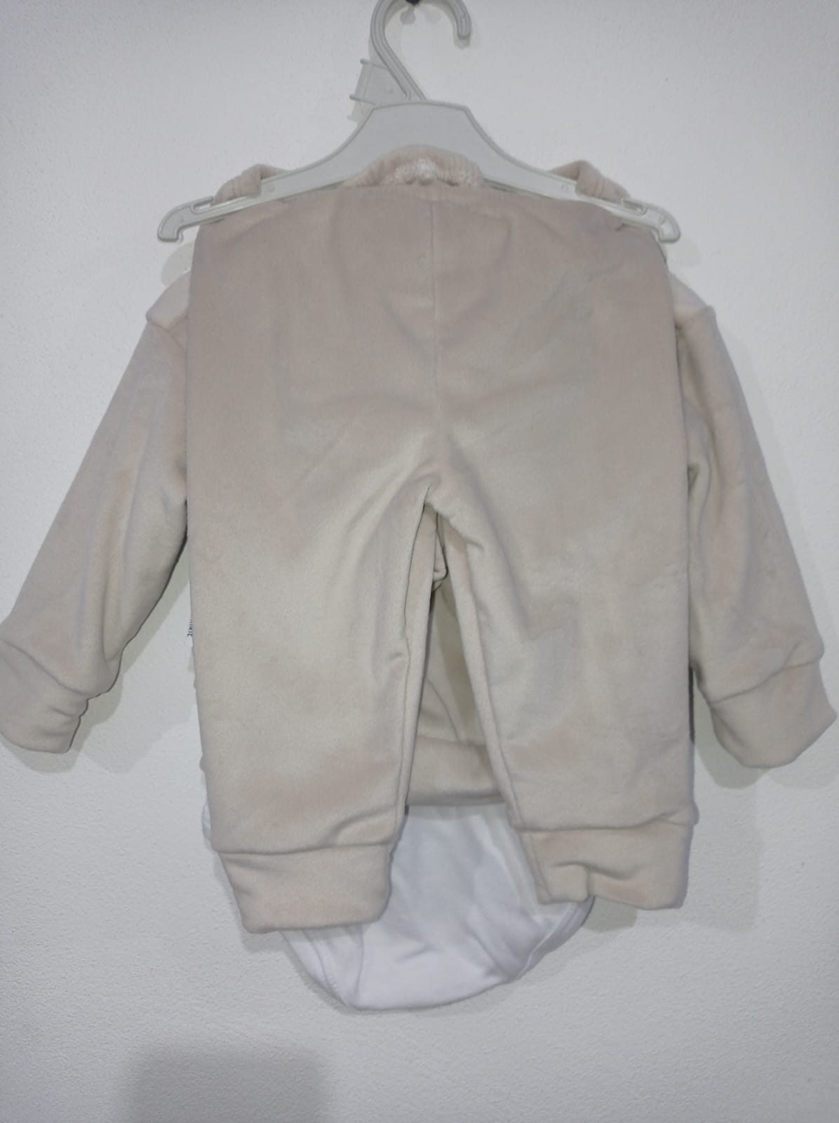 Contiene: Body manga larga blanco + Pantalón beige de plush + Camperita con gorro beige de plush con orejitas