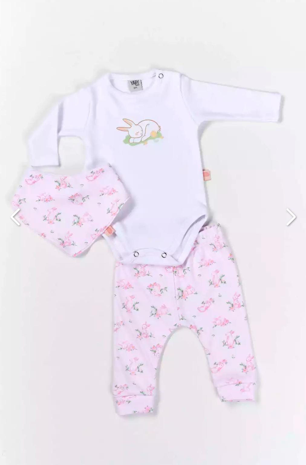 Ajuar con Body y pantalon estampado de interlock con bandana en presentación de cajita.