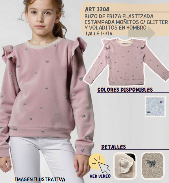 Buzo de frisa elastizada y estampada «Moñitos con glitter» y voladitos en hombro